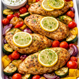 Alles zusammen ca 25-30 Minuten backen, bis das Hähnchen goldbraun und durchgegart ist.