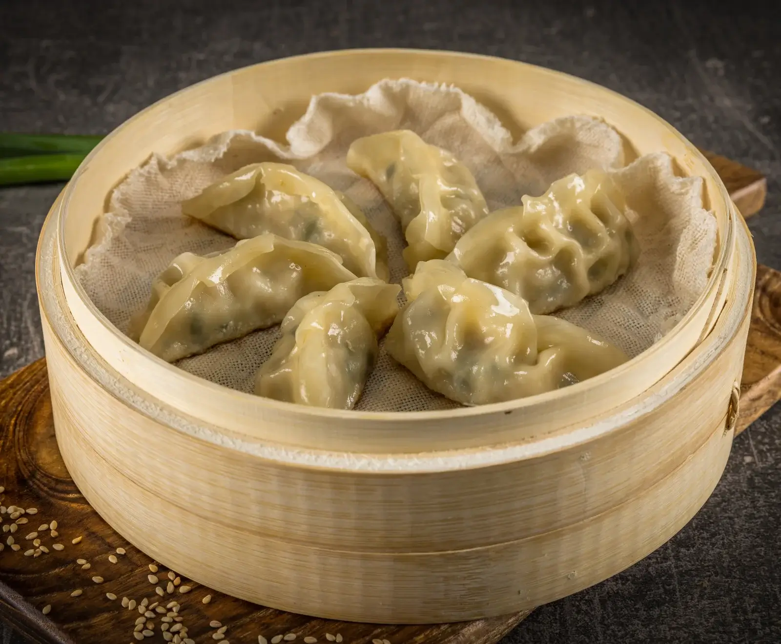 In der Pfanne für 5 Gyoza die Pfanne vorheizen, 5 Esslöffel Wasser hinzufügen und ohne Öl 4–5 Minuten garen. Im Dampfgarer, Wasser zum Kochen bringen und die Gyoza 8 Minuten dämpfen. In der Fritteuse bei 180 °C für 2–3 Minuten frittieren.
