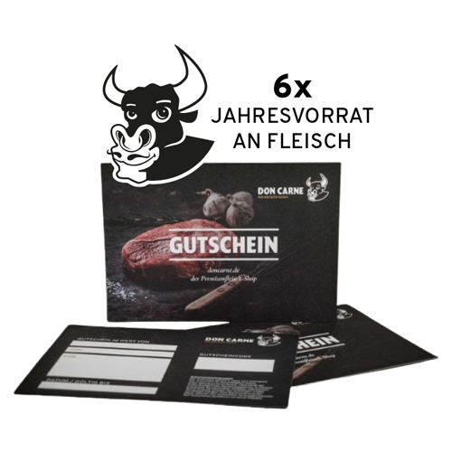 Gewinne einen von fünf Jahresvorräten an Premiumfleisch von Don Carne! Der Preis umfasst 6 Gutscheine à 250 €, die du für erstklassiges Fleisch nach Wahl einlösen kannst. Genieße das ganze Jahr über hochwertige Cuts von Rind, Schwein, Geflügel und mehr. Verwöhne dich und deine Lieben mit Fleischgenuss auf höchstem Niveau!
