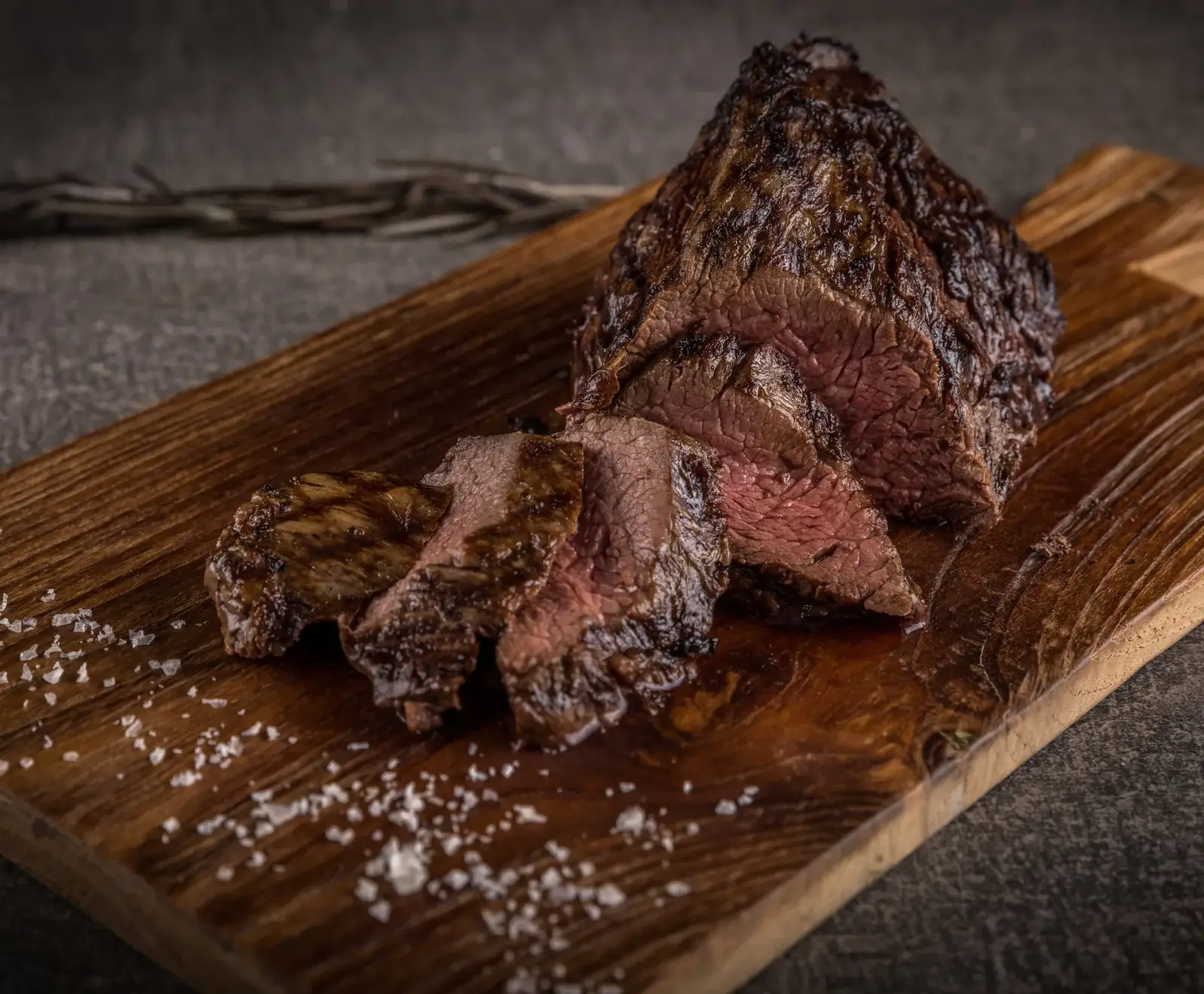 Um einen gleichmäßigen Garpunkt zu erzielen, schneiden Sie die schmalere Spitze und den stärkeren Kopf des Filets ab – das abgeschnittene Fleisch eignet sich hervorragend für Steaks oder Geschnetzeltes. Das Mittelstück im Ganzen scharf anbraten und als Filet Wellington mit Pilzfarce in Blätterteig wickeln. Im Backofen bei mittlerer Hitze bis zu 55-57 °C Kerntemperatur garen.