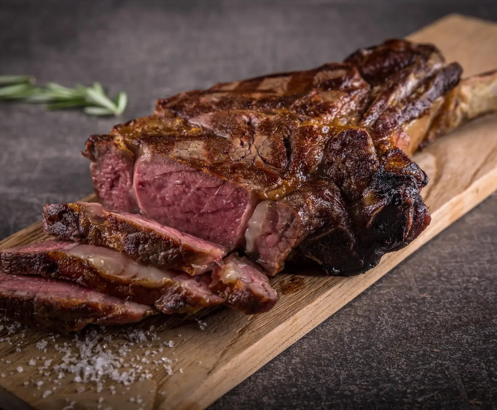 Das Steak idealerweise auf dem Grill zubereiten, da es aufgrund des extra langen Knochens für die Pfanne meist zu groß ist. Von jeder Seite etwa 90 Sekunden lang bei direkter Hitze scharf anbraten, anschließend in einer indirekten, temperaturgemäßigten Zone des Grills auf den gewünschten Garpunkt ziehen lassen. Beidseitig nach Geschmack salzen und pfeffern. Tipp: Vom Knochen schneiden und am Knochen anrichten. Den Knochen noch für Suppe verwenden.