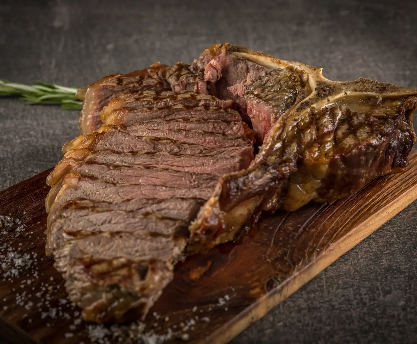 Das T-Bone-Steak wird aus dem flachen Roastbeef geschnitten. Der Knochen trennt das Roastbeef vom kleineren Filet. Bei der Zubereitung auf dem Grill nach dem scharfen Anbraten das fettärmere, magere Filet von der Hitzezufuhr abwenden. Unser Tipp: Legen Sie beim Braten eine dicke große Zwiebel- oder Kartoffelscheibe unter das Filet, um es zu schützen. Dabei entsteht ganz nebenbei eine köstliche Röstzwiebel oder -kartoffelbeilage.