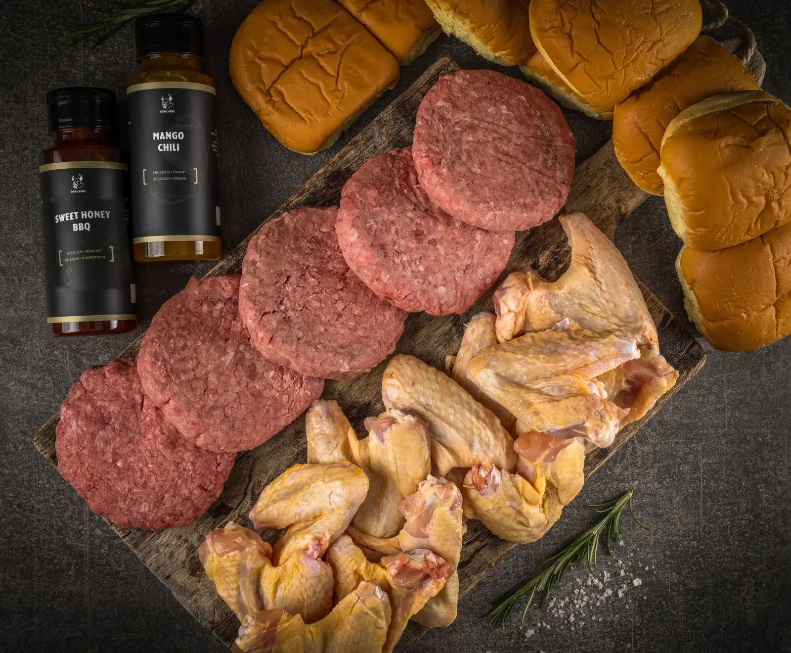 Burger vom US Black Angus Rind, Hähnchenflügel vom Maishähnchen aus Frankreich