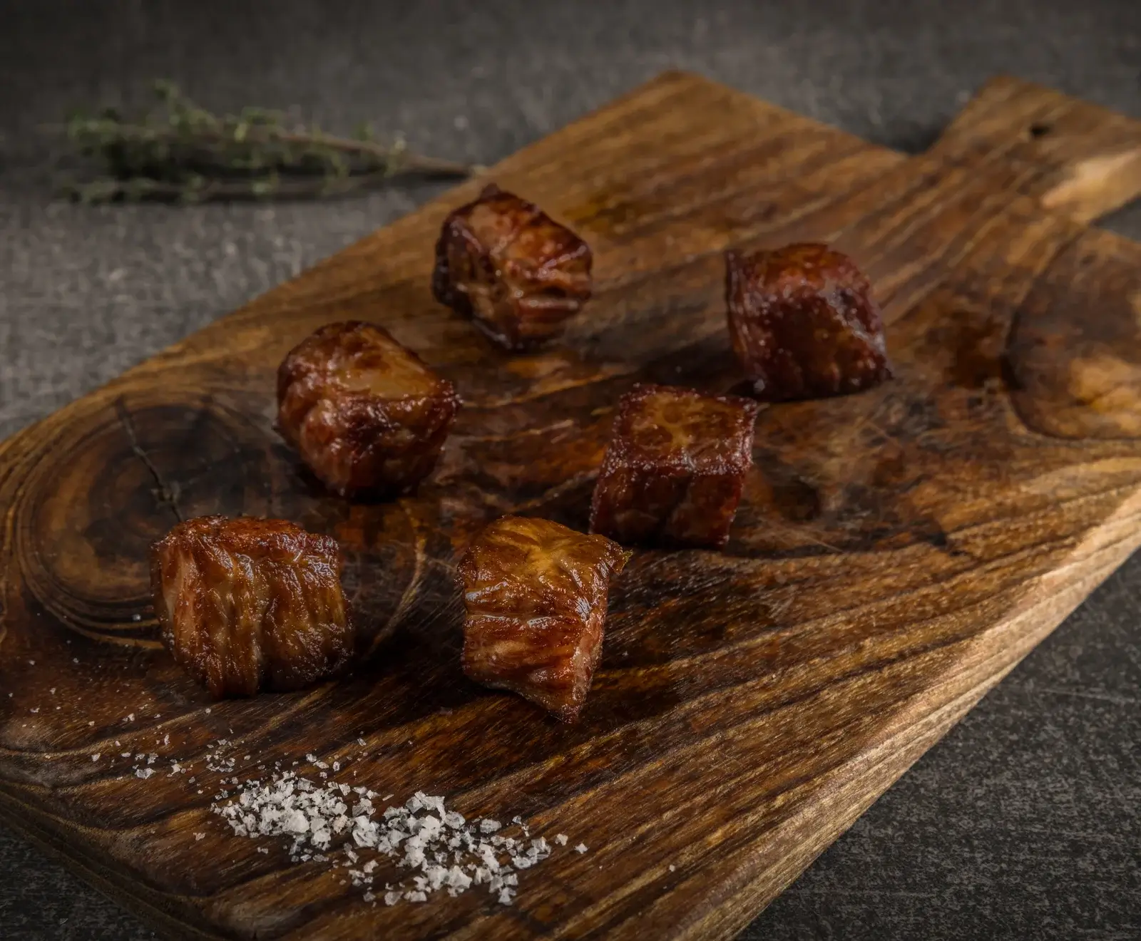 Aufgrund dem hohen Anteil intramuskulösen Fetts empfehlen wir eine geringere Kerntemperatur von ca. 52 °C für den optimalen Fleischgenuss. Das aromatische Fett schmilzt früher als üblich und sorgt für den unnachahmlichen Wagyu-Geschmack. Bei hoher Temperatur auf dem Grill oder in der Pfanne beidseitig scharf anbraten und bei milder Hitze garziehen lassen. Salzen und Pfeffern nach Geschmack.