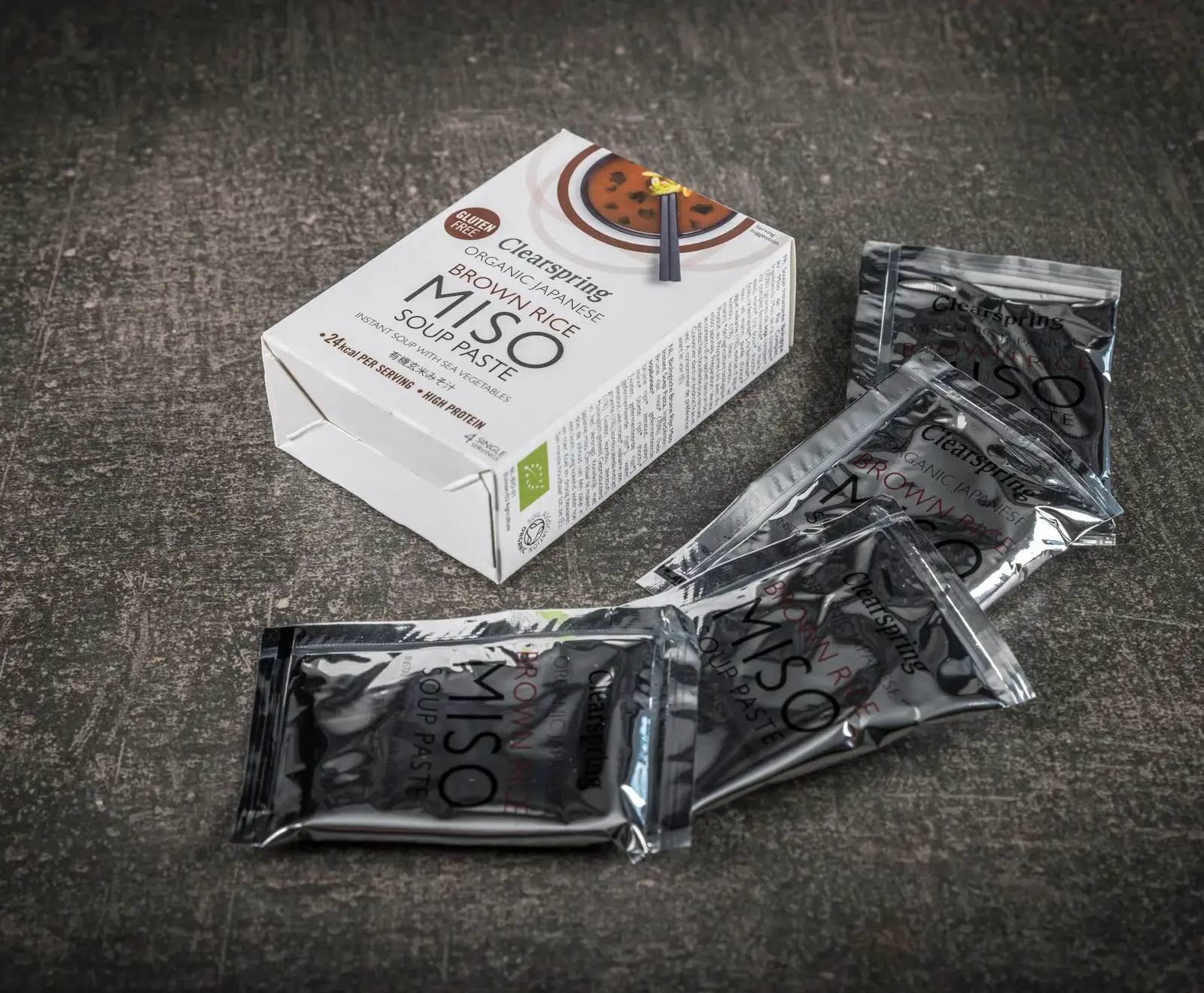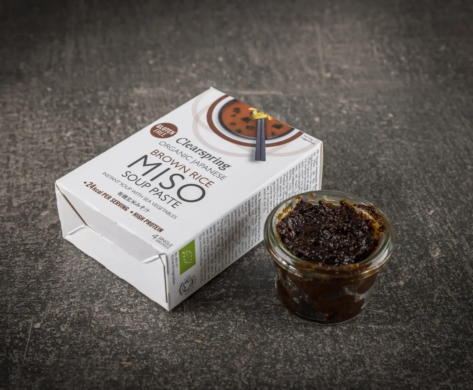 Miso aus braunem Reis* (70%) (ganze Sojabohnen*, kultivierter brauner Reis*, Meersalz, Wasser), Mirin* (süßer Reis*, Shochu* [Wasser, kultivierter Reis*], kultivierter Reis*), Wasser, Meersalz, Zwiebelpüree*, Wakame-Meeresgemüse (1%), Kombu-Meeres Gemüseextrakt (1%)(Wasser, Kombu, Meersalz). *aus biologischem Anbau